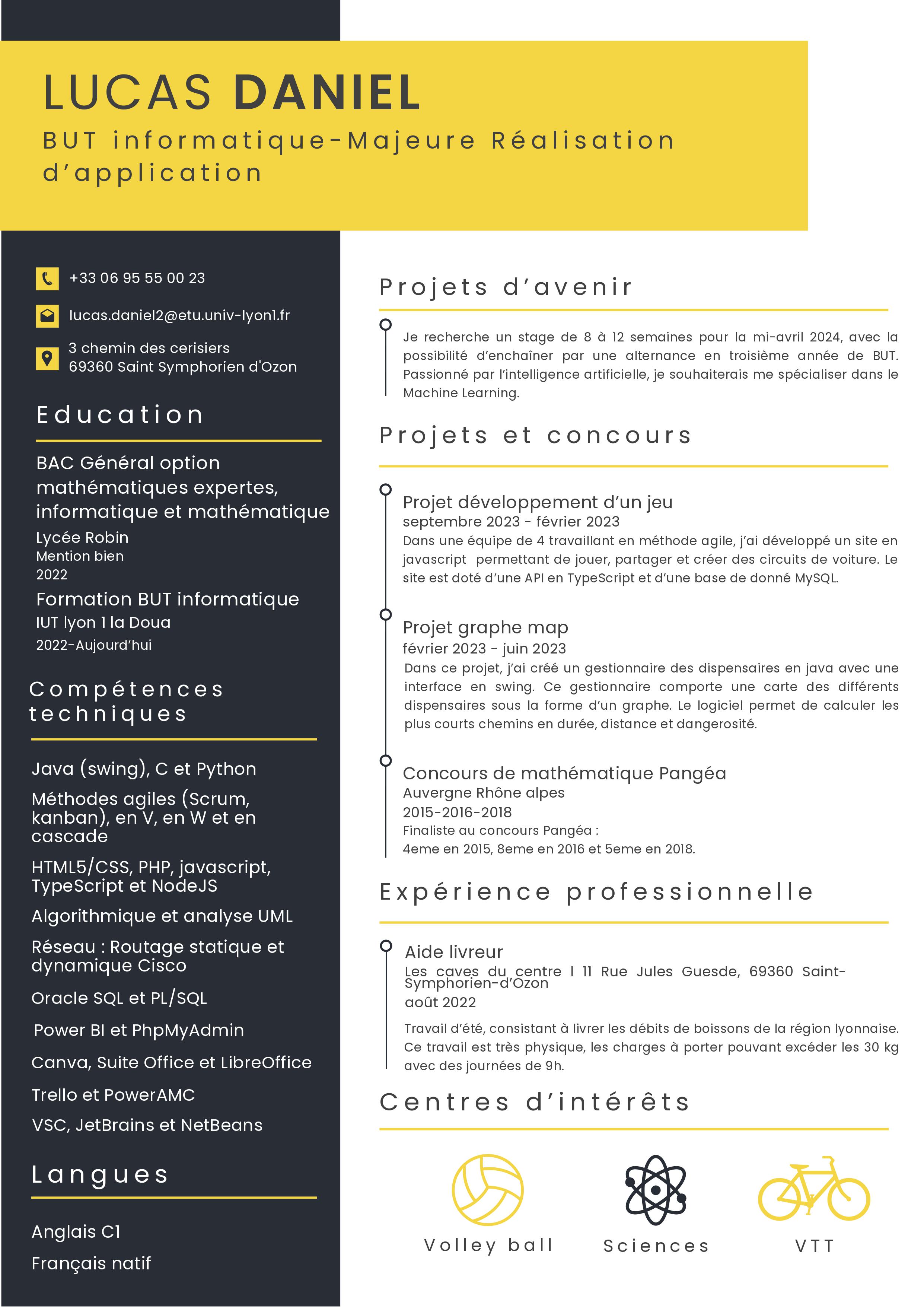 Je m’appelle Lucas Daniel. Né en 2004, je suis actuellement étudiant en informatique à l’IUT Lyon 1. Depuis mes 14 ans, je nourris une passion intense pour l’informatique et l’intelligence artificielle. Cette passion a orienté mon parcours académique et mes projets personnels. Mon intérêt profond pour ces domaines me pousse à constamment explorer de nouvelles technologies, à suivre les dernières avancées et à participer à des projets innovants. L’IA, en particulier, m’a captivé par son potentiel transformateur et ses applications variées, du traitement du langage naturel au machine learning.